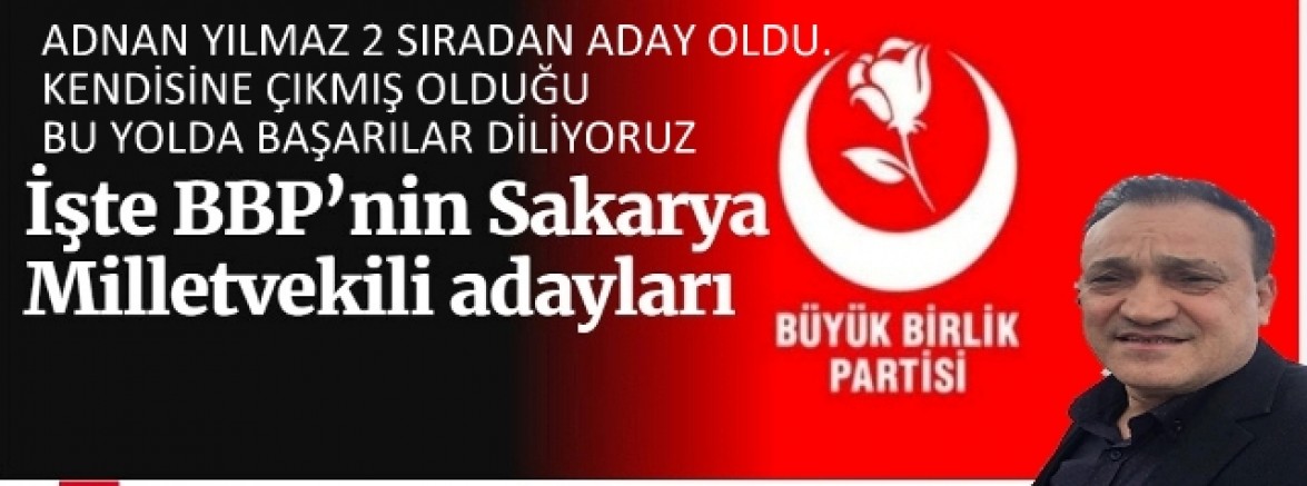 14 Mayıs Genel Seçimleri öncesi Cumhurbaşkanlığı seçiminde Recep Tayyip Erdoğan’a destek olacaklarını açıklayan fakat milletvekilliği seçiminde kendi listeleriyle yarışacak BBP’de listeler belli oldu. Sakarya'da açıklanan aday listesinde ilk sırada Cengiz Bayar, ikinci sırada ise Adnan Yılmaz yer aldı.