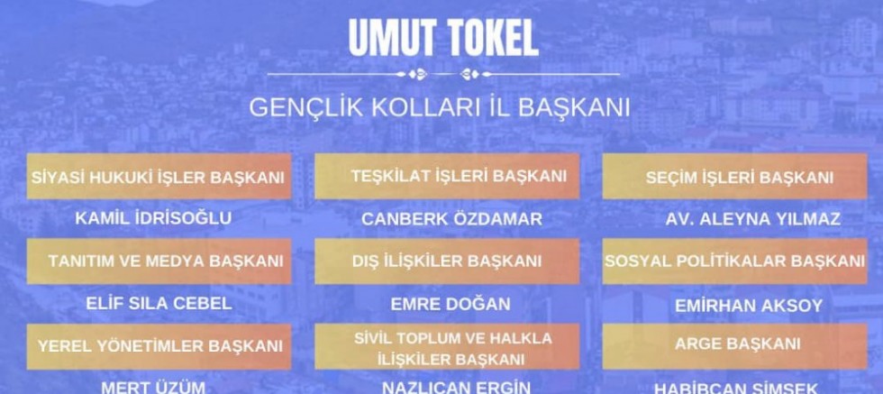 Siyasi Hukuki İşler Başkanı: Kamil İdrisoğlu, Tanıtım Ve Medya Başkanı: Elif Sıla Cebel, Yerel Yönetimler Başkanı: Mert Üzüm, Ekonomi Mali Ve İdari İşler Başkanı: İsmail Hakkı Aktaş, İnsan Hakları Başkanı: Metehan Ülker, Teşkilat İşleri Başkanı: Canberk Özdamar, Dış İlişkiler Başkanı: Emre Doğan, Sivil Toplum Ve Halkla İlişkiler Başkanı: Nazlıcan Ergin, Üniversiteler Başkanı: Arda Kılıçarslan, Çevre Şehir Başkanı: Neşegül Selvi, İl Sekreteri: Elif Aşçı, Seçim İşleri Başkanı: Av. Aleyna Yılmaz, Sosyal Politikalar Başkanı: Emirhan Aksoy, Arge Başkanı: Habibcan Şimşek, Yeni Seçmen Başkanı: Murat Kurt, Bilgi İletişim Başkanı: Berat Yıldırım.