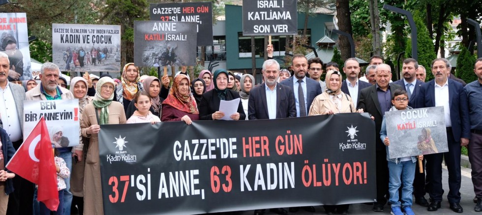 Katılımcıların “Anne katili İsrail”, “Gazze’de hergün 37’si anne 63 kadın ölüyor”, “Gazze’de ölenlerin %70’inden fazlası kadın ve çocuk” yazılı dövizler taşıdığı etkinlikte açıklama yapan AK Parti İl Kadın Kolları Başkanı Münire Şeyhoğlu, Gazzeli anneler için susmayacaklarını belirterek, “Pazar günü anneler günü. Günlerdir her yerde tatlı bir telaş yaşanıyor. Anneler günü öksüzlerin ve evladını kaybeden annelerin de ağır imtihanı fakat bir yandan da dünyanın orta yerinde, yanı başımızda Filistin’de, Gazze’de, Refah’ta yaşanan soykırım nedeniyle anne olmak hiç bu kadar zor olmamıştı. Biz bugün okuldan gelecek çocuklarımızı, Gazzeli anneler ise çocuklarına verecek bir lokma ekmeği bekliyor. Bizler karışmasın diye çocuklarımızın defterlerine, kitaplarına isim yazarken, Gazzeli anneler ise cesetleri teşhis edilebilsin diye çocuklarının kollarına isim yazıyor. Bir kadın, bir anne olarak çok net ifade ediyorum: her can tek, her can biricik ve ‘bir cana kıyan tüm insanlığa kıymış gibidir” dedi.