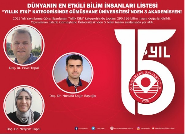 Türkiye’den de birçok bilim insanının yer aldığı “Dünyanın En Etkili Bilim İnsanları” listesinde, Üniversitemizden Mühendislik ve Doğa Bilimleri Fakültesi Gıda Mühendisliği Bölümü’nden Doç. Dr. Fevzi Topal, Elektrik-Elektronik Mühendisliği Bölümü’nden Doç. Dr. Mustafa Engin Başoğlu ve Gümüşhane Sağlık Hizmetleri Meslek Yüksekokulu/Tıbbi Hizmetler ve Teknikler Bölümü’nden Doç. Dr. Meryem Topal yer aldı.