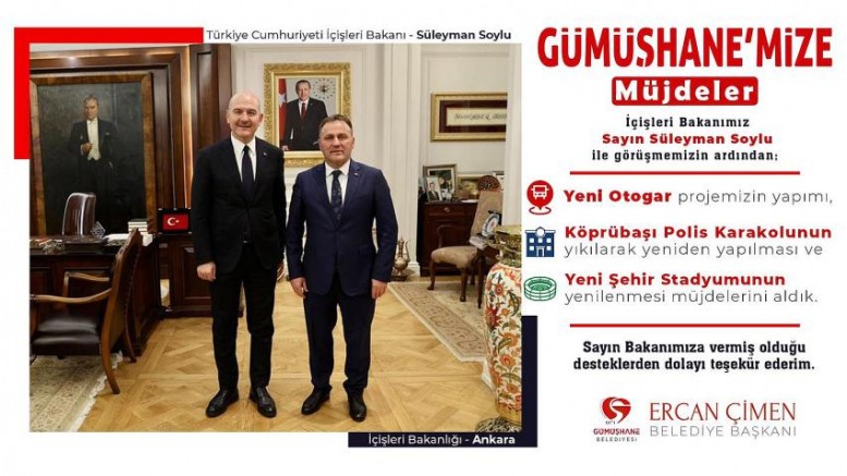 Gümüşhane Belediye Başkanı Ercan Çimen, İçişleri Bakanı Süleyman Soylu ziyaretinden kentte 3 müjdeyle döndü. Gümüşhane Belediye Başkanı Ercan Çimen, sosyal medya hesabından yaptığı paylaşımda, İçişleri Bakanı Süleyman Soylu’yu makamında ziyaret ettiğini belirterek, “İçişleri Bakanımız Sayın Süleyman Soylu ile Gümüşhane’mizi ve projelerimizi konuştuk. Sayın Bakanımızdan Gümüşhane’mize müjdeler aldık. Değerli Bakanımıza misafirperverlikleri için çok teşekkür ediyorum” ifadelerini kullandı. Yapılan paylaşımın görselinde ise ‘yeni otogar projesi, köprübaşı polis karakolunun yıkılarak yeniden yapılması ve yeni şehir stadyumunun yenilenmesi müjdelerini aldık’ denildi.