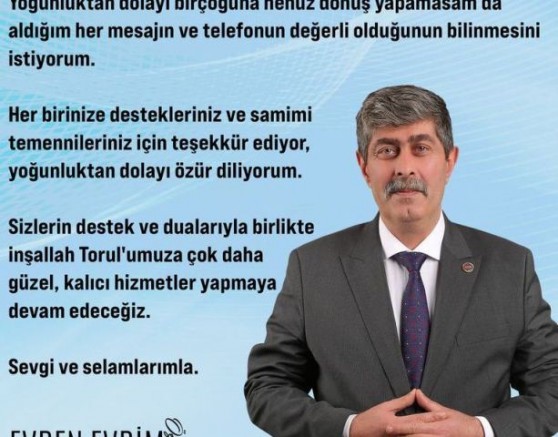 Pazar günü gerçekleşen seçim sonrasında elde ettikleri başarıdan dolayı birçok destek telefonu ve tebrik mesajı aldığını, yoğunluktan dolayı birçoğuna henüz dönüş yapamadığını ifade eden Özdemir, “Aldığım her mesajın ve telefonun değerli olduğunun bilinmesini istiyorum. Her birinize destekleriniz ve samimi temennileriniz için teşekkür ediyor, yoğunluktan dolayı özür diliyorum. Sizlerin destek ve dualarıyla birlikte inşallah Torul’umuza çok daha güzel, kalıcı hizmetler yapmaya devam edeceğiz. Ayrıca, tebrik ve hayırlı olsun için çiçekleriniz yerine Şehit Aileleri Yardımlaşma Sosyal Kültürel ve Dayanışma Derneği’ne bağış yapmanızı rica ediyorum. Sevgi ve selamlarımla” dedi.