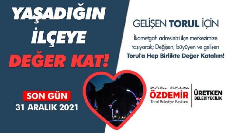 Torul Belediye Başkanı Evren Özdemir İller Bankası'nın katkı paylarından Torul ilçesinin daha fazla faydalanabilmesi ve Torul Belediyesi’nin daha fazla hizmet sunabilmesi için var olan nüfusun arttırılmasına yönelik, Torul’da ikamet etmesine rağmen, başka il, ilçe köylerinde ikametgâhı bulunan vatandaşların mağduriyet yaşamamaları için ikametgâhlarını Torul’a almaları çağrısında bulundu. Bu konuda tüm Torul’lu vatandaşların gerekli hassasiyet ve özeni göstererek örnek vatandaşlığın gereğini yerine getireceğine inanan Başkan Özdemir yapmış olduğu çağrısında şu ifadelere yer verdi.