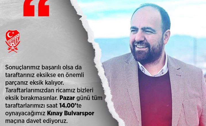 Yakut, açıklamasının sonunda, sporun en önemli parçasının taraftar olduğuna değinerek “Sonuçlarımız başarılı olsa da taraftarınız eksikse en önemli parçanız eksik kalıyor. Taraftarlarımızdan ricamız bizleri eksik bırakmasınlar. Pazar günü tüm taraftarlarımızı saat 14:00’te oynayacağımız Kınay Bulvarspor maçına davet ediyoruz” ifadelerini kullandı.