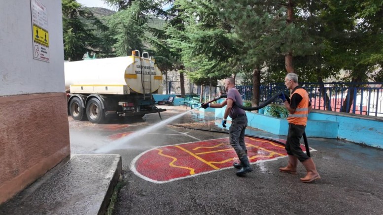 Temizlik İşleri Müdürlüğü ve Park ve Bahçe İşleri Müdürlüğü ekipleri birçok okulda sürdürülen temizlik çalışmaları kapsamında okul bahçeleri, oyun alanları çöplerden ve otlardan arındırırken, tazyikli su ile yıkandı, okulların ortak kullanım alanlarında ilaçlama çalışması yaptı.