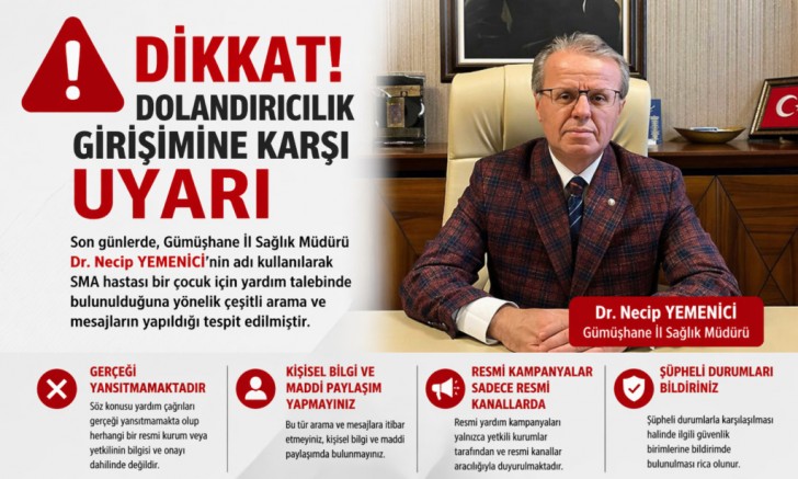 Son günlerde, Gümüşhane İl Sağlık Müdürü Dr. Necip Yemenici’nin adı kullanılarak SMA hastası bir çocuk için yardım talebinde bulunulduğuna yönelik çeşitli arama ve mesajların yapıldığı tespit edildi.