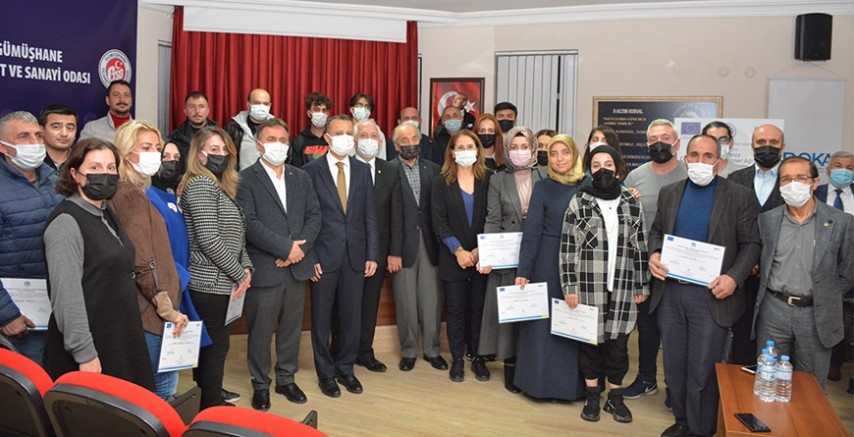 Konuşmaların ardından Gümüşhane Valisi Kamuran Taşbilek, Belediye Başkanı Ercan Çimen ve GTSO Başkanı İsmail Akçay tarafından katılımcılara sertifikaları verildi.