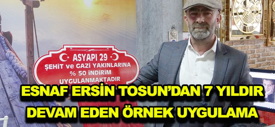 Vatanın birliği ve bütünlüğü için canını ortaya koyan şehitler için bu fedakarlığın bile az olduğunu belirten Ersin Tosun, “7 yıldan bu yana şehit ve gazi yakınlarına yüzde 50 indirim uyguluyorum. Bunu uygularken müthiş bir haz alıyorum. Sanki o şehidin bire bir yakını benmişim gibi hissediyorum. Gümüşhane’de bir şehit yakını amcamızın evine mutfak dolabı, tezgah ve duvar kağıdı uygulaması yaptık. Eve gidince farklı bir duygu hissettim, sanki o şehit benim kardeşimmiş gibi. İsteğimdir, dileğimdir canı pahasına bizim çoluğumuz çocuğumuz refah içinde yaşasın, okuluna gidip gelebilsin diye, huzurlu bir şekilde büyüsün diye canını ortaya koyan yiğitler için inanın ki bunlar azdır. Allah’ım rahmetiyle muamele eylesin. Bütün esnaf kardeşlerimize de tavsiye ediyorum, verdiğiniz 50 TL’lik malı 25 TL’ye verdiğiniz zaman, rabbim başka bir kapıdan size 100 TL ödeyecektir. Rabbim askerlerimizi iki cihanda muzaffer eylesin. Onlar bizim, onurumuz, şerefimiz. Benim çocuğum şehit olmayacak diye bir kaide yok. Hepimizin çocuğu bu vatanın evladıdır. Onlar da şehit olabilir, sen ben diğer arkadaşlar da direk şehit yakını olabilirler Türkiye’deki bütün esnaflara çağrımdır, şehit ve gazi yakınlarına hassaten rica ediyorum indirim uygulayın Allah rızası için, Türk olduğumuzu görsün bütün dünya alem” dedi.