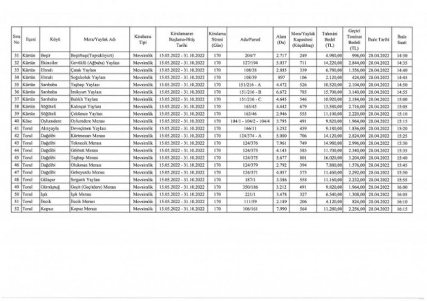 Merkez ilçeye bağlı 30 mera ve yaylak, Köse ilçesine bağlı 1 mera, Kürtün ilçesine bağlı 9 mera ve yaylak ile Torul ilçesine bağlı 12 mera ve yaylak olmak üzere ihtiyaç fazlası toplam 52 mera ve yaylak 28 Nisan 2022 Perşembe günü 2886 Devlet İhale Kanunu’nun 51/g maddesi gereğince pazarlık usulü ile mevsimlik kiraya verilecek.