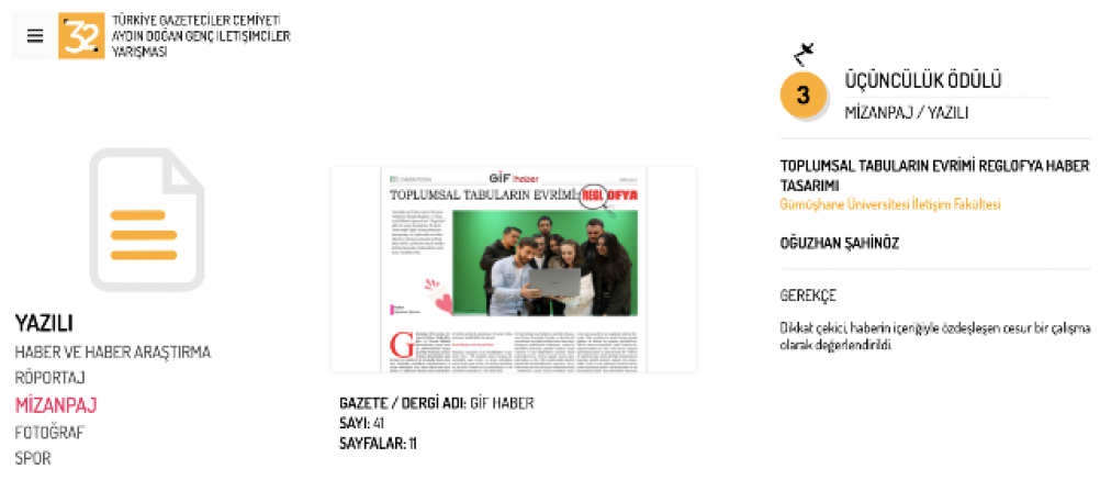 “Reglofya” isimli sosyal medya projesi; menarş dönemindeki genç kızların ve kadınların bu durumdan dolayı toplum tarafından ötekileştirmeyi, akran zorbalığını, regl haline karşı olan geleneksel ve toplumsal tabulara karşı mücadeleyi hedefleniyor. Bu kapsamda hayata geçirilen proje, Türkiye Gazeteciler Cemiyeti ve Aydın Doğan Vakfı tarafından 32. kez düzenlenen Genç İletişimciler Yarışması’nda mizanpaj ve sosyal medya projesi dalından 3’cülük ödülü kazandı. Ödülle ilgili duygularını paylaşan, ekip üyelerinden Neslihan Araz şunları söyledi: “Üniversiteye başladığım zamandan itibaren hedeflediğim ve içinde olmak istediğim bir yarışmaydı. Öncelikle böyle bir proje ile ödülü alıyor olmaktan gurur duyuyorum. Ekip arkadaşlarım ve değerli hocalarım başta olmak üzere herkese emeklerinden dolayı teşekkür ederim. Umarım bizler, diğer arkadaşlarımıza öncü oluruz ve onlarda bu heyecanı yaşarlar.”
