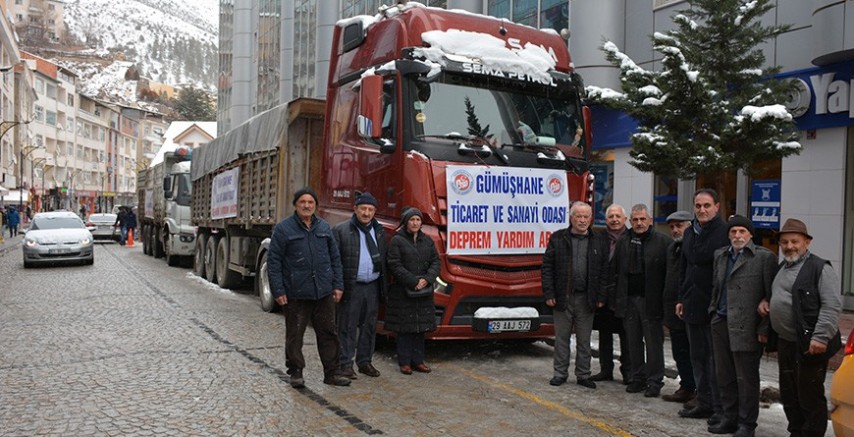 Kahramanmaraş'ta gerçekleşen bölgedeki yaklaşık 13 milyon insanı etkileyen 7,7 ve 7,6 büyüklüğündeki depremlerin ardından afetzedelerin yaralarını sarmak için hızlı bir şekilde tüm üyelerine ve Gümüşhanelilere bildirimlerde bulunarak yardım kampanyasına başlayan Gümüşhane Ticaret ve Sanayi Odası iki tır dolusu yardım toplayarak, afet bölgesine gönderdi.