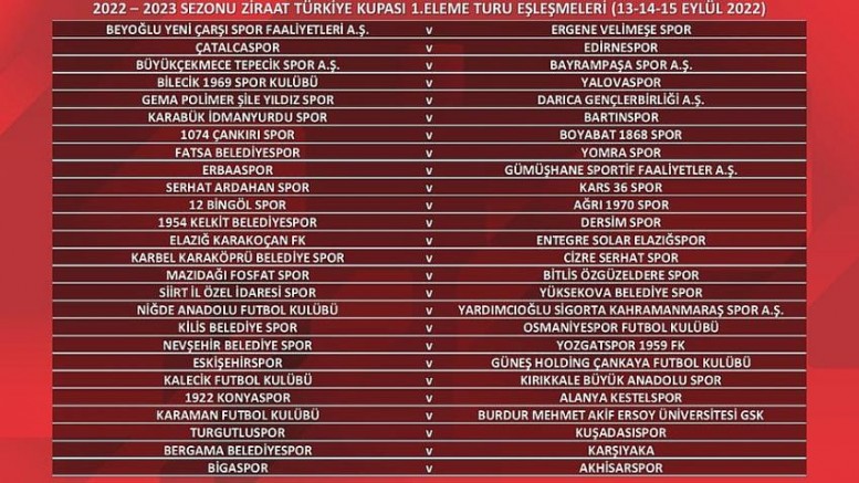 Ziraat Türkiye Kupası Müsabakaları Statüsü'nün 3/1/b maddesine istinaden Ziraat Türkiye Kupası 1. Eleme Turu eşleşmeleri bugün TFF Riva Hasan Doğan Milli Takımlar Kamp ve Eğitim Tesisleri'nde yapılan kura çekimi ile belirlendi.