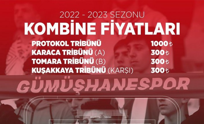 Kırmızı-beyazlı temsilcimizde kombine kartlardan Şeref Tribünü 1.000 TL, Gümüşhane tarafındaki Tomara (FUAT YALÇINKAYA) Tribünü 300 TL, dere tarafındaki Karaca Tribünü 300 TL ve tünel tarafındaki Kuşakkaya Tribünü 300 TL olarak belirlendi.