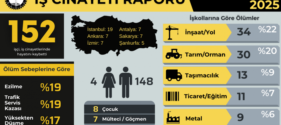 Trabzon ise Adıyaman, Aydın, Çorum, Denizli, Düzce, Kayseri, Mersin, Osmaniye, Samsun ve Tekirdağ ile birlikte 2 işçinin yaşamını yitirdiği kentler arasında yer aldı. 1’er ölüm Aksaray, Amasya, Ardahan, Bartın, Bingöl, Burdur, Çankırı, Edirne, Eskişehir, Karaman, Kırıkkale, Kırklareli, Malatya, Mardin, Muş, Ordu, Siirt, Şanlıurfa, Tokat, Irak, İtalya ve Suudi Arabistan’da meydana geldi…