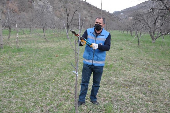İlimizde 24 bin dönüm alanda toplu meyvelik bahçeleri olduğunu belirten İl Müdürü Birşen, Budama, özellikle meyve ağaçlarında kök ile gövde dengeyi sağlayabilmek, devamlı ve düzenli ürün alabilmek için ağaç üzerinde tepe alma, uç alma, genişletme işlemlerinin tümüne budama diyoruz. Meyve fidanlarındaki dikim budaması, şekil budaması, verim budaması, gençleştirme budaması gibi türleri vardır. Budama ile ağacın dengesini sağlanabilir ve bu çok önemlidir. Ağacın içine güneş ışınlarının girmesiyle verim, kalite artışı da gerçekleşir. Budama olmazsa ağacın içine güneş girmez ve meyve kalitesinde düşüşler oluyor. Budamanın geç yapılmasıyla erken açmalar önlenir ve bahar donlarının verdiği zarar aza indirgenir. Budama yaparken meyve gözü olan dallar budanmaz ve budama ağacın gövdesine güneş ışınlarını engelleyen dallardan başlanmalıdır.” dedi.
