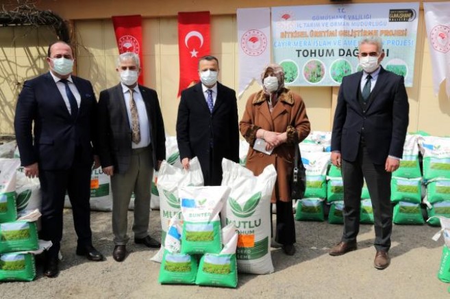 Tarım ve Orman Bakanlığı ile İl Özel İdaresi destekleriyle alınarak dağıtımı yapılan tohumdan 14 bin dekar alanda 20 bin ton yem bitkisi üretilerek, 10 milyon lira gelir elde edilmesi hedefleniyor.Gümüşhane Vali Kamuran Taşbilek, Tarım ve Orman İl Müdürlüğü bahçesinde düzenlenen torum dağıtım töreninde gazetecilere, projenin amacının ekonomiye dahil edilmeyen atıl arazileri tarımsal üretime dahil etmek olduğunu söyledi.Proje kapsamında alınan 90 ton tohumun üreticilere dağıtılacağını dile getiren Vali Taşbilek, şunları söyledi:"Toprak tarla olmadığı müddetçe değerini kaybediyor. Toprağı tarla yapmak, tarlayı vatan yapmak demektir. Ekilen her bir toprak parçası vatanın bir savunmasıdır. Bugün Tarım ve Orman Bakanlığımız ile İl Özel İdaremizin destekleriyle 1 milyon 178 bin liralık destekle Tarım Kredi Kooperatifimizden temin ettiğimiz 90 ton tohumu vatandaşlarımızla buluşturacağız. Bunun karşılığında 14 bin dekar alanda 20 bin ton ürün elde etmeyi amaçlıyoruz."Çiftçilerin tarımsal faaliyetlerle toprağı vatan etme noktasında büyük bir çaba ve fedakarlık içindeki olduğunu kaydeden Vali Taşbilek, "Geçen yıl pandemi süreci başladığında Cumhurbaşkanımız 'Kesinlikle üretim zinciri kopmayacak, desteklenecek' talimatı vardı. Bu manada her türlü fedakarlığı yapacağız. Çiftçilerimiz ve hayvancılıkla iştigal eden vatandaşlarımız kesinlikle mağdur edilmeyecek. Onların üretim zincirine devam etmesi için her türlü çaba sarf edilecek. Çünkü üretimi olmayan bir memleket bitmiş demektir." diye konuştu.Törene, İl Genel Meclisi Başkanı Mehmet Emin Erdoğdu, İl Özel İdaresi Genel Sekreteri Ekrem Akdoğan, Tarım ve Orman İl Müdürü Edip Birşen, Tarım Kredi Kooperatifi Trabzon Bölge Müdürü Osman Tomruk, İl Genel Meclisi üyeleri ve üreticiler katıldı.