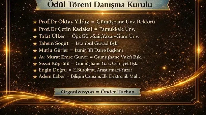 Organizasyonun objektifliğini sağlamak adına kurulan Danışma Kurulu’nda Gümüşhane’nin tanınmış isimleri yer alıyor. Kurulda Gümüşhane Üniversitesi Rektörü Prof.Dr Oktay Yıldız, Pamukkale Üniversitesinden Prof.Dr Çetin Kadakal, Şair-Yazar-Akademisyen Talat Ülker, İstanbul GÜYAD Başkanı Tahsin Söğüt, İzmir Büyükşehir Belediyesi Daire Başkanı Mutlu Gürler, Gümüşhane Vakfı Başkanı Av. Murat Emre Güner, Gümüşhane Gazeteciler Cemiyeti Başkanı Sezai Köprülü, E.Bürokrat- Araştırmacı-Yazar Engin Doğru ve Bilişim Uzmanı, Elk.Elektronik Mühendisi Adem Ezber bulunacak.