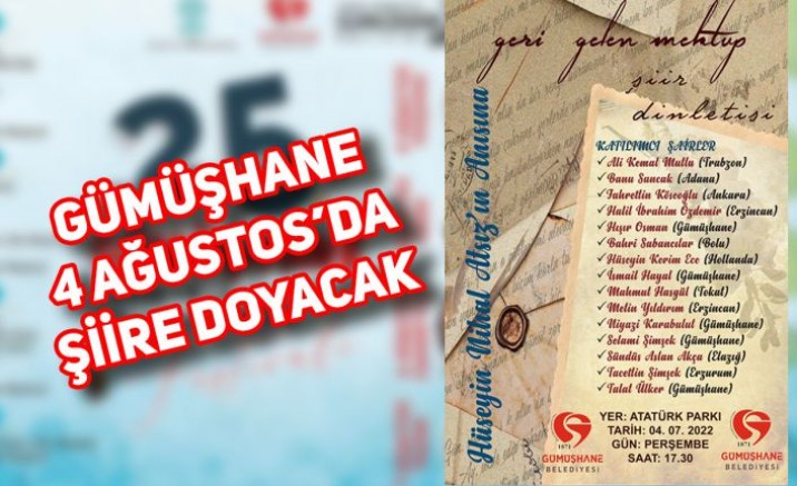 Şiir dinletisi programına katılacak şairler ise şöyle: Trabzon’dan Ali Kemal Mutlu, Adana’dan Banu Sancak, Ankara’dan Fahrettin Köseoğlu, Erzincan’dan Halil İbrahim Özdemir, Gümüşhane’den Hışır Osman, Bolu’dan Bahri Sabancılar, Hollanda’dan Hüseyin Kerim Ece, Gümüşhane’den İsmail Hayal, Tokat’tan Mahmut Hasgül, Erzincan’dan Metin Yıldırım, Gümüşhane’den Niyazi Karabulut, Selami Şimşek, Elazığ’dan Sündüs Aslan Akça, Erzurum’dan Tacettin Şimşek ve Gümüşhane’den Talat Ülker.