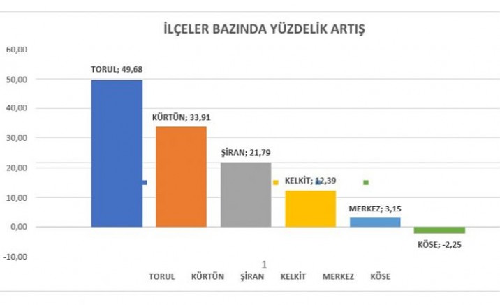Kurumdan yapılan açıklamada ilçeler bazında yüzdelik artış tablosunda Torul’un yüzde 49,68, Kürtün’ün yüzde 33,90, Şiran’ın ise yüzde 21,79 artış ile üstün başarı sağladığı bildirildi.