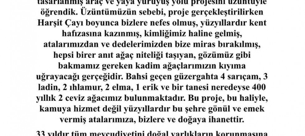 TEMA’dan yapılan açıklamada, eski Köprübaşı Karakolu’ndan başlayarak Harşit Çayı boyunca uzanacak projenin, trafik yoğunluğunu azaltma hedefi taşısa da çevreye ciddi zararlar verebileceği ifade edildi. Açıklamada, “Bu güzergâhta 4 sarıçam, 3 ladin, 2 ıhlamur, 2 elma, 1 erik ve yaklaşık 400 yıllık 2 ceviz ağacı bulunuyor. Bu proje bu haliyle kamuya hizmet değil, doğaya ihanettir” denildi.