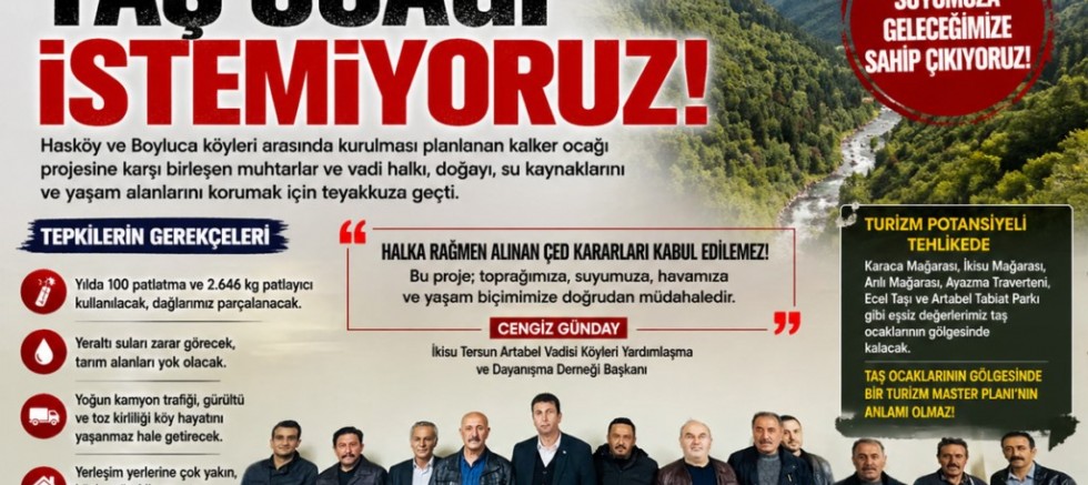 Geçtiğimiz yıllarda da benzer şekilde bir araya gelen dernek çatısı altındaki muhtarlar, sivil toplum temsilcileri ve siyasi parti temsilcileri, söz konusu projelere karşı tepki göstermiş ve çeşitli girişimlerde bulunmuştu. Bugün ise aynı kararlılıkla hareket eden köy muhtarları, temsil ettikleri köy halkının bu süreçten büyük rahatsızlık duyduğunu, endişeyle gelişmeleri takip ettiğini belirterek yeniden bir araya geldi. İkisu Tersun Artabel Vadisi halkının teyakkuzda olduğunu vurgulayan muhtarlar, taş ocağı projesine karşı olduklarını ve bu projeyi istemediklerini güçlü şekilde dile getirdi.
