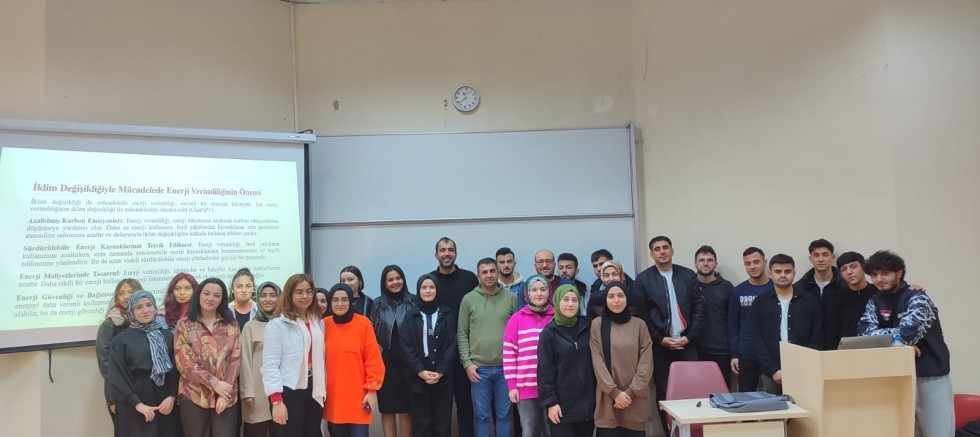 Sağlık Bilimleri Fakültesi Acil Yardım ve Afet Yönetimi bölümü Dr. Öğr. Üyesi Sefa Mızrak, Dr. Öğr. Üyesi Zekiye Göktekin ve Arş. Gör. Nurcan Şimşek’in de katıldığı programda konuşan Doç. Dr. Akyol iklim değişikliğinin günümüzde hem gelişmiş hem de gelişmekte olan ülkeler açısından çözüm gerektiren en önemli krizlerden biri haline dönüştüğünü söyledi. Doç. Dr. Akyol konuşmasının devamında; “İklim krizinin en önemli kaynağı artan insan etkisi ve enerji tüketimidir. Karbon temelli enerji tüketimi küresel sera gazı emisyonlarının yüzde 75’inden fazlasını ve tüm karbondioksit emisyonlarının yaklaşık yüzde 90’ını oluşturarak, küresel iklim değişikliğine açık ara en büyük etkiyi yapmaktadır. Bu nedenle enerji verimliliği toplumların gerek iklim değişikliğiyle mücadelesinde gerekse de buna uyum süreçlerinde kritik bir rol oynamaktadır” sözlerine yer verdi.