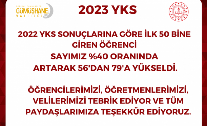 Açıklamada verilere göre Gümüşhane’de yaklaşık 100 öğrencinin dereceye girerek büyük bir sevinç yaşattığı, bunun yanında ilk 1000’e giren öğrencilerin başarısının onur madalyaları olduğu ifade edilerek 2022-YKS’de ilk 50 binde bulunan öğrenci sayısı 56 iken, 2023-YKS’de bu sayının yaklaşık yüzde 40’lık artışla 79’a yükseldiği belirtildi.