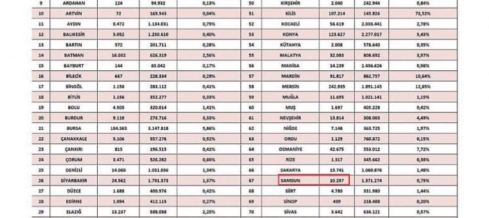 Amasya 712, Artvin 463, Bayburt 111, Bartın 1555, Bolu 4 bin 707, Çorum 1957, Düzce 2 bin 9, Giresun 1630, Gümüşhane279, Karabük 8 bin 105, Kastamonu 1940, Ordu 2 bin 354, Rize 1015, Sinop 440, Tokat 2 bin 564, Trabzon 6 bin 246 ve Zonguldak 1737.
