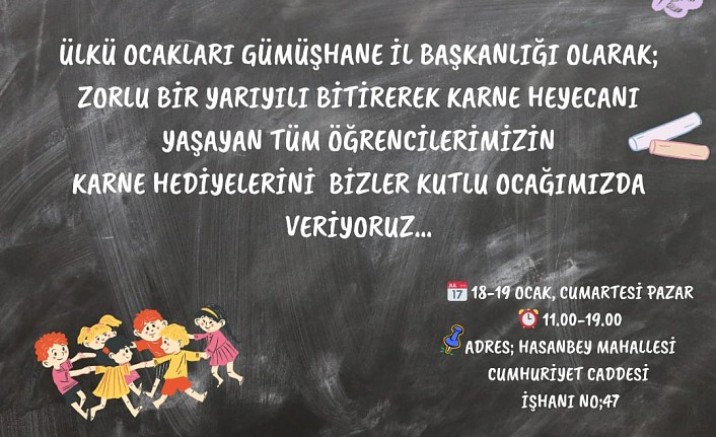 Ülkü Ocakları Gümüşhane İl Başkanlığı binasında Cumartesi-Pazar günü düzenleyecekleri programla 10.00-19.00 saatleri arasında karneleriyle gelen tüm öğrencilere çeşitli hediyeler vereceklerini kaydeden Coşkun, “Karnelerini alan öğrenci kardeşlerimizin sevinçlerine ortak olmak istedik. Bu nedenle karnesiyle gelen öğrencilere çeşitli hediyeler, sürpriz oyuncaklar vereceğiz. Ayrıca Ülkü Ocakları Eğitim ve Kültür Vakfı Genel Merkezimizin hazırladığı Türk büyükleri okuma kitapları, bilgi akını, Odak 2023 yazılımı UOUzem ve yüz boyama gibi hediyelerimiz var” dedi.