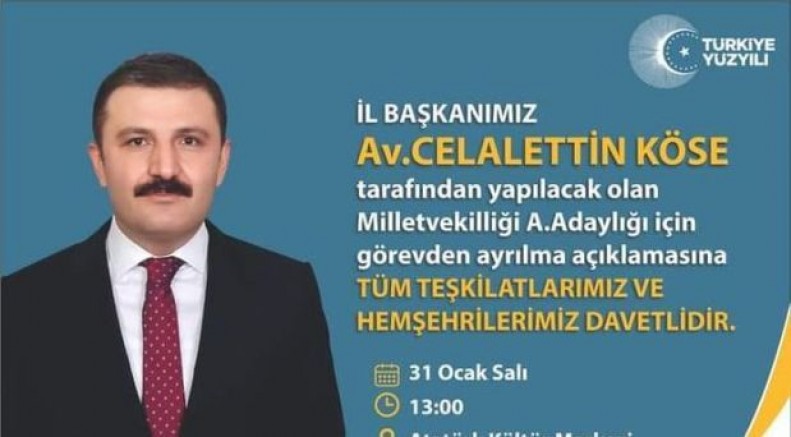 AK Parti Gümüşhane İl Başkanı Celalettin Köse Milletvekili aday adaylığı sebebiyle görevden ayrıldığını duyurdu