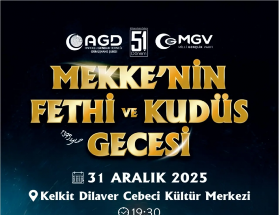 Anadolu Gençlik Derneği (AGD) ve Milli Gençlik Vakfı (MGV), her yıl 31 Aralık’ta düzenlenen “Mekke’nin Fethi ve Kudüs Gecesi” programını bu yıl da Türkiye genelinde eş zamanlı olarak gerçekleştirecek. Program, AGD ve MGV’nin 51. dönem faaliyetleri kapsamında 81 il ve yüzlerce ilçede düzenlenecek.