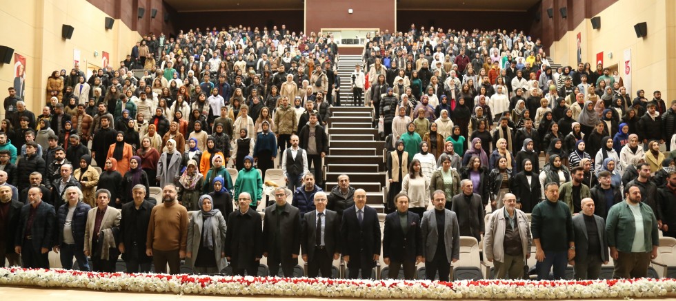 Prof. Dr. Şaban Ali Düzgün’e değerli konuşmasından dolayı teşekkür eden Rektörümüz Prof. Dr. Halil İbrahim Zeybek; “Hocamıza öncelikle çok teşekkür ediyorum. Anlattığı konularla ruhumuz doydu. Kendilerini, kendi topraklarında, kendi Üniversitesinde ağırlamanın mutluluğunu yaşadık. Seçilen konu son derece anlamlıydı. ‘Merhamet’ konusu insanların ve toplumların temel meseleleri arasında yer alıyor. Bu kutsal kitabımız Kur-anı Kerim’in en önemli temalarından da birisidir. Bunun önemine binaen de felsefeden sosyolojiye, hukuktan dine ve eğitime kadar birçok bilim dalının en önemli araştırma konularından bir tanesidir. Bunu aldığımız zaman o kelimenin yerini şiddet alıyor. İnsana, hayvana, kadına, erkeğe, öğrenciye ve çocuğa şiddet alıyor. Güncel yaramızın sebebi de merhametsizliktir. Yıllarca Avrupa’da batıda öldürülerek öldürmeyi öğrenen Yahudiler, 1948’den sonra sık sık yaptıkları gibi o bölgede Filistinli kardeşlerimizi 7 Ekim’den itibaren de Gazze ve Batı Şeria’da öldürmeye devam ediyorlar. İsrail’in beşinci başbakanı İzak Rabin, lakabı Kemikkıran Rabin’di. Çünkü askerlere Filistinli çocukların kemiklerinin kırılmasını emrediyordu. Merhamet olsa bir başbakan böyle bir emir verebilir mi? Bunun gibi bir kadın milletvekili ‘bir kurşunla iki can alın’ diye İsrailli askerlere hamile kadınların karınlarından vurulmasını telkin ediyordu. Ama Yaratıcının rahmeti, hepimizin hatırladığı bir Firavun hayatı var. İsrail oğullarından bir erkek çocuğun saltanatına son vereceğini öğrendiğinde Firavun, bütün Yahudi erkek çocukları öldürtmüştü. Ama Allah kendi sarayındaki Hz. Musa’ya onun tahtını, saltanatını sona erdirme gücü ve iradesini verdi. İnsanlık tarihi kadar eski Hz. Adem’in çocuklarına belki merhamet kavramını Habil-Kabil mücadelesine kadar götürmek mümkündür. Hocamız yarınlar için düne göre tablonun daha iyi olacağına dair çok çarpıcı örnekler verdi. Dualarımız, dileğimiz ve temennilerimiz eğitim yoluyla çözüleceğine inandığımız bu temel problemimizin bir an önce çözülmesidir. Ruh sağlığı yerinde olan her insanın taşıması gereken yaratılışta var olan merhamet kavramı bizi biz yapan kavramlardan biridir. Hocamız çok farklı yönleriyle bugün ruhumuzu doyurdu. Prof. Dr. Şaban Ali Düzgün hocamıza aramızda bulunmasından ve değerli bilgilerinden dolayı çok teşekkür ediyorum. Kendilerini Üniversitemizde ağırlamaktan büyük memnuniyet duyduk” sözlerine yer vererek kendisine plaket takdiminde bulundu.