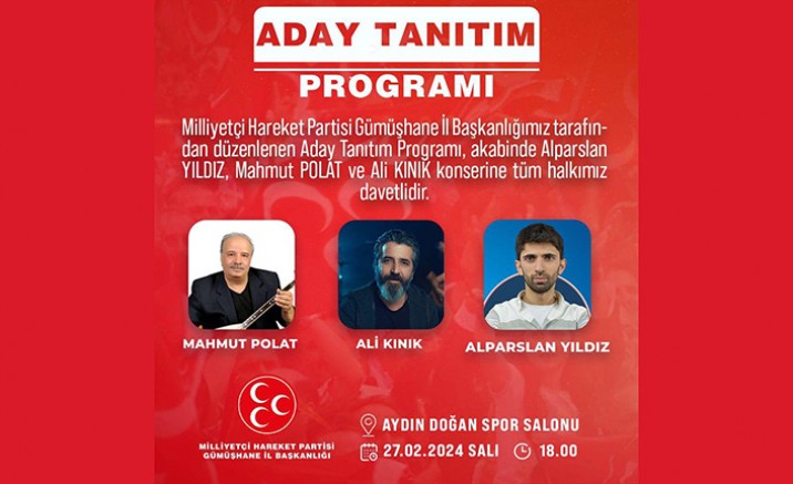 Büyük bir coşku ile düzenlenecek programa ilişkin MHP Gümüşhane İl Başkanlığı tarafından yapılan açıklamada, “27 Şubat Salı günü tüm Gümüşhanelileri Aydın Doğan Spor Salonu’na bekliyoruz. Aday tanıtım programımızda,31 Mart yerel seçimler için MHP’nin Gümüşhane adaylarını tanıtacağız. Programın ardından da Alparslan Yıldız, Mahmut Polat ve Ali Kınık’ın katılımıyla muhteşem bir konser düzenlenecek. Tüm hemşehrilerimizi bu anlamlı programa ve konsere davet ediyoruz” ifadeleri kullanıldı.