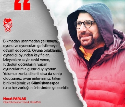Bıkmadan usanmadan çalışmaya, oyunu ve oyuncuları geliştirmeye devam edeceğiz. Oyuna odaklanıp, oynadığı oyundan keyif alan, izleyenlere seyir zevki veren, futbolun doğrularını yapan oyuncularımla gurur duyuyorum. Yolumuz zorlu, dikenli olsa da sahip olduğumuz oyun anlayışımız, takım birlikteliğimiz ve Gümüşhanespor ruhu her zorluğun üstesinden gelecektir.