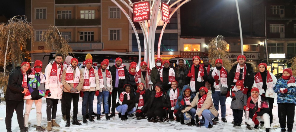 Üniversitemiz Uluslararası Öğrenci Koordinatörlüğü tarafından ve Sosyal Bilimler Meslek Yüksekokulu Saç Bakımı ve Güzellik Hizmetleri Bölümü Öğr. Gör. Ahmet Sayın’ın organizasyonunda tören alanına götürülen öğrencilerimiz burada tören hakkında bilgi alarak şehitlerimizi andı. Öğrencilerimiz hava sıcaklığının sıfırın altında 10 derece olduğu törende binlerce kişiyle beraber ellerinde Türk bayraklarıyla şehitler için yürüdü. Türkiye’nin dört bir yanından Sarıkamış’a gelen binlerce kişi, ellerinde Türk bayrakları ile Kızılçubuk zirvesinden yürüyüşe geçti. Uluslararası öğrencilerimizin ellerinde Türk Bayraklarıyla gerçekleştirdiği yürüyüş katılımcılardan ve yerel halktan büyük ilgi gördü. Gerçekleştirilen 5 kilometrelik yürüyüşün ardından Sarıkamış Harekatı’na katılan askerlerin kıyafetleriyle törende yer alan Sarıkamış 9’uncu Komando Tugay Komutanlığı’na bağlı askerler, alandaki dev Türk bayrağının altında nöbet tuttu.