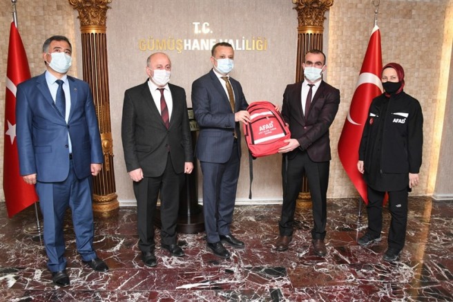 Gümüşhane Valiliğinde düzenlenen programda, Vali Kamuran Taşbilek, Afet ve Acil Durum Yönetimi Başkanlığı (AFAD) Eğitim Daire Başkanı Nalan Aydın ve AFAD İl Müdürü Mesut Bayrak, İl Milli Eğitim Müdürü Seydi Doğan ile bazı okul müdürlerine afet ve acil durum çantası takdim etti.