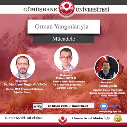 Üniversitemiz Kürtün Meslek Yüksekokulu ve Orman Genel Müdürlüğü tarafından Orman Yangınlarıyla Mücadele başlıklı ortaklaşa bir Webinar gerçekleştirilecek.