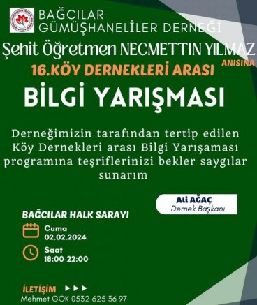 Bağcılar Gümüşhaneliler Derneği Tarafından Şehit Necmettin Yılmaz Anısına 16.Köy Dernekleri Arası Bilgi Yarışması Düzenlenecek.