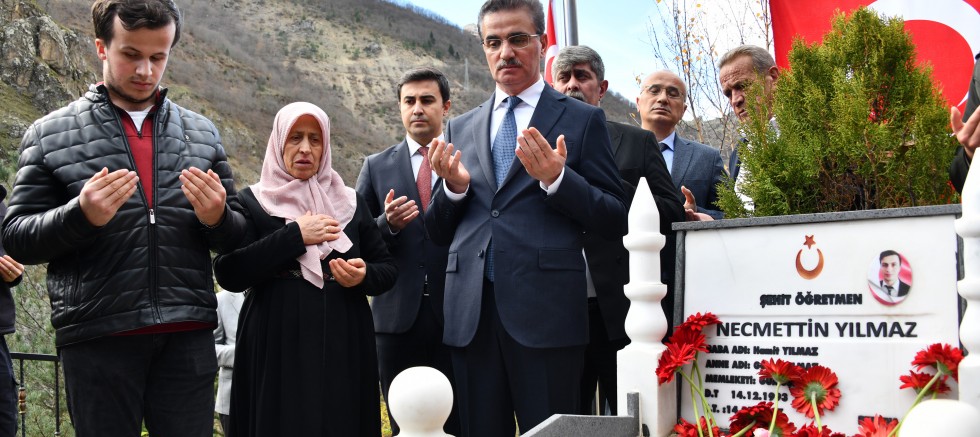 Görev yaptığı Şanlıurfa’dan memleketi Gümüşhane’ye dönerken 2017 yılında teröristler tarafından kaçırılarak 8 aylık öğretmenken şehit edilen sınıf öğretmeni Necmettin Yılmaz, 24 Kasım Öğretmenler Gününde kabri başında düzenlenen programla anıldı.