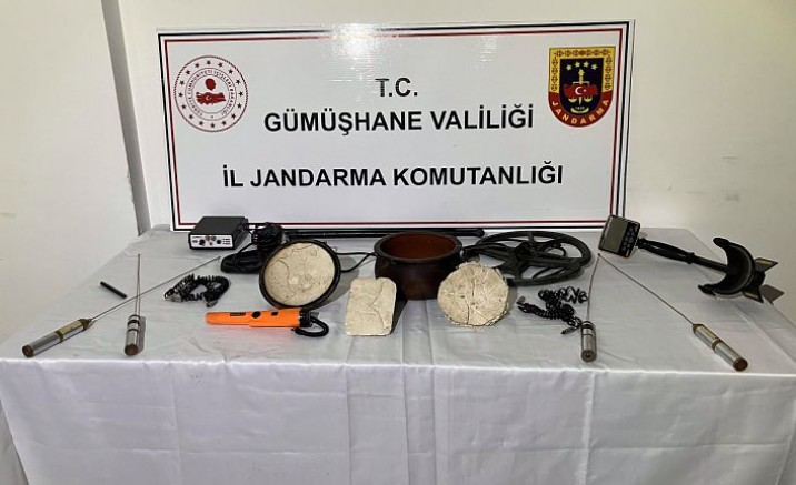 Jandarma ekipleri tarafından yapılan adli arama neticesinde 1 adet dikdörtgen şeklinde beyaz tablet üzerine kazınmış harita, 1 adet yuvarlak şeklinde beyaz tablet üzerine kazınmış harita, 1 adet çömleğe ait kapak içerisinde sabitlenmiş haritaya benzer şekiller olan beyaz tablet, 1 adet çömlek, 2 adet metal arama dedektörü ve 1 adet alan tarama olarak tabir edilen dedektör ele geçirilerek el konuldu.