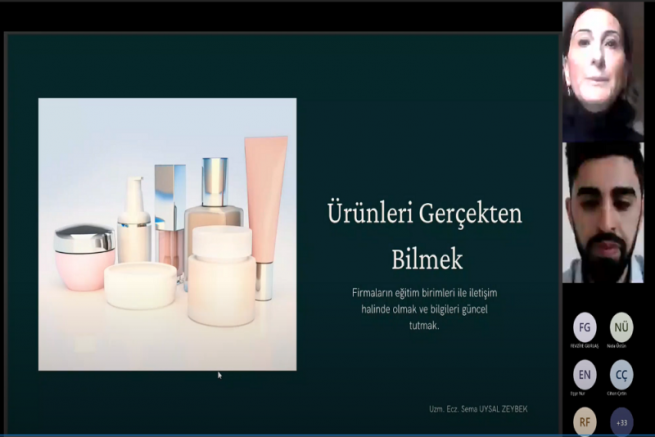 Üniversitemiz uzaktan eğitim sistemi ile gerçekleştirilen çevrim içi etkinlikte dermokozmetiğin hayatımızdaki yeri, kullanım noktalarında dikkat edilmesi gerekenler, kozmetik ile dermokozmetik arasındaki farklar ele alındı. Bir eczacı teknikeri olarak öğrencilerin dermokozmetikte bilgi, birikim ve hangi noktalarda kendilerini geliştirmesi gerektiği konularına yer verilen etkinlikte Uzman Eczacı Sema Uysal Zeybek; vücut yapısına göre dermokozmetik ürün alımı hususlarına dikkat edilmesi gerektiğini anlatarak, eczanenin konumuna göre bu ürünlerin pazarlama stratejileri hakkında bilgiler verdi.