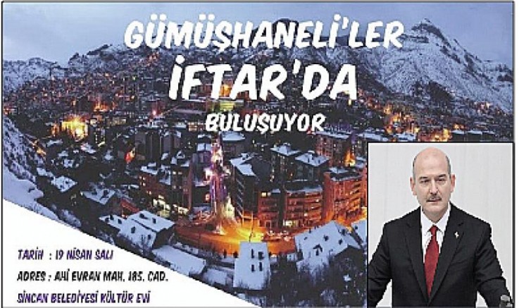 Ankara GÜDEF tarafından yapılan açıklamada; 19 Nisan Salı günü Sincan Belediyesi Kültür Evi'nde İçişleri Bakanımız Sayın Süleyman Soylu’nun katılacağı iftar programımıza tüm hemşerilerimiz (aileleriyle) davetlidir, denildi.