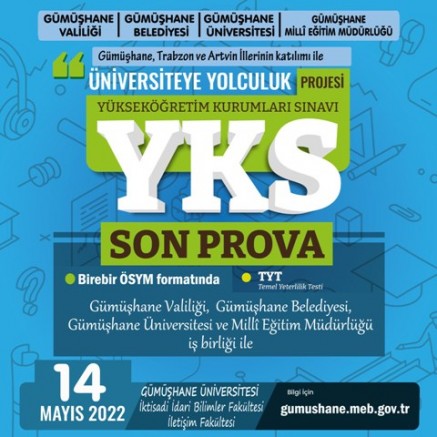 Trabzon İl Milli Eğitim Müdürlüğü koordinasyonunda, Gümüşhane Üniversitesi, Gümüşhane İl Milli Eğitim Müdürlüğü ile yürütülen ve bu yıl 8.si yapılacak olan "Üniversiteye Yolculuk Projesi" kapsamında, 14 Mayıs 2022 Cumartesi günü üniversiteye girmeyi planlayan gençleri gerçek sınav psikolojisine hazırlamak amacıyla YKS ile aynı formatta deneme sınavı yapılacak.