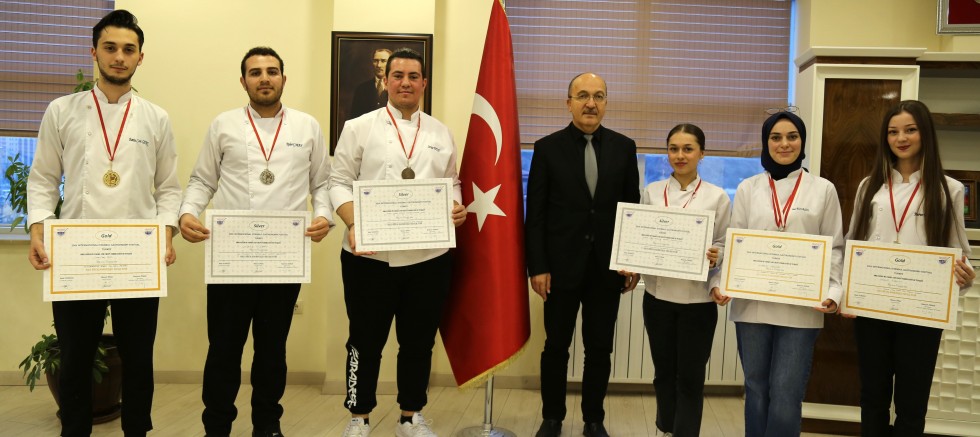 Katılım sağlanan 4 kategoriden 3’ünde altın madalya alarak birinci, 1 kategoride de Gümüş madalya alarak ikinci olan Turizm Fakültesi Gastronomi ve Mutfak Sanatları Bölümü öğrencilerimiz, takım olarak katılım sağladıkları ‘Yılın En İyi Üniversite Ekip Yarışması’nda ise 48 üniversite arasından Gümüş madalya ile ikinci olarak büyük bir başarıya imza atmışlardı. Ödülle dönen ekibe Rektörümüz Prof. Dr. Halil İbrahim Zeybek tarafından “Teşekkür Belgesi” verildi. Rektörlük makamında gerçekleştirilen merasime başarı gösteren öğrencilerimiz ile Turizm Fakültesi Dekanı Sevim Beyza Öztürk Sarıkaya, Dekan Yardımcısı Doç. Dr. İsmail Çalık, Gastronomi ve Mutfak Sanatları Bölümünden Doç. Dr. Savaş Evren ve Öğr. Gör. Rıfat Pir katıldı.