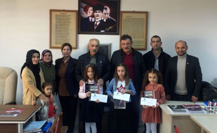 ADD Gümüşhane Şube Başkanı Arife Eleman ve dernek üyelerinin katıldığı etkinlikte 1. olan Fevzipaşa İlkokulundan Gülfem Nadide Soydaş, 2. olan Işıl Sema Doğan İlkokulundan Göknur Hasret Coşkun ve 3. olan Dumlupınar İlkokulundan Feyza Balaban’a Mustafa Kemal Atatürk’ün “Nutuk” kitabı ve bir miktar para hediye edildi.