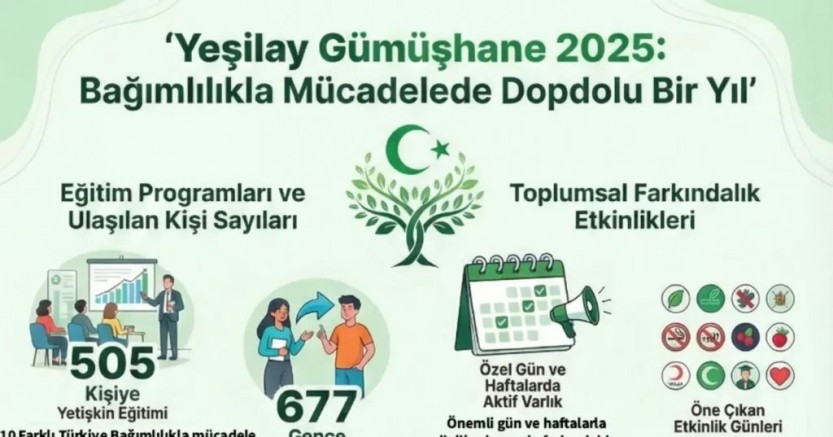 Yeşilay Gümüşhane Şubesi, 2025 yılı boyunca bağımlılıkla mücadelede koruyucu ve önleyici yaklaşımı merkeze alan çalışmalarını toplumun tüm kesimlerine yayarak sürdürdü. Eğitim faaliyetlerinden saha çalışmalarına, gönüllülükten sosyal ve kültürel etkinliklere kadar uzanan geniş bir alanda yürütülen çalışmalarla binlerce kişiye ulaşıldı.