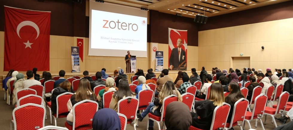 Üniversitemiz Kongre ve Kültür Merkezi Karaca Salonu’nda gerçekleştirilen eğitim seminerinde araştırma ve alıntı kaynaklarını toplamak ve yönetmek için tarayıcı eklentisi olarak kullanılan, açık kaynak ve özgür bir kaynakça yönetimi yazılımı olan ZOTERO hakkında bilgiler verildi.